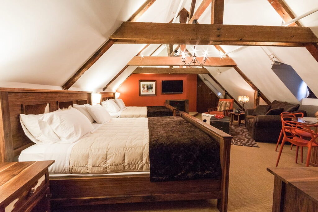 This room is located beneath the roof of the inn, featuring exposed brick walls and hundred year-old wood beams. The charm of this French-Canadian style makes this room a cozy place to rest during your stay.